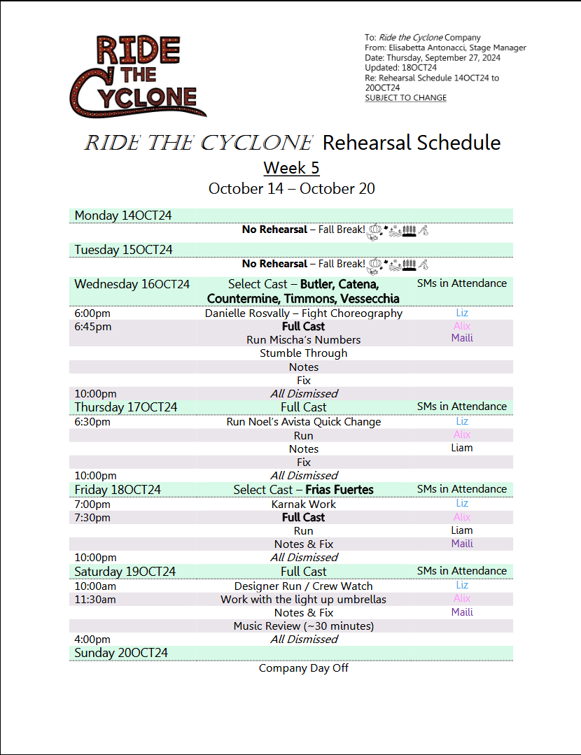 Rehearsal Schedules Back to Ride the Cyclone Main Page Ride the Cyclone Performance Reports Ride the Cyclone Rehearsal Reports Ride the Cyclone Calling Script Ride the Cyclone Line Notes You are Here! Ride the Cyclone Production Meeting Reports Ride the Cyclone Misc. Paperwork